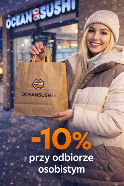 Chcesz zapłacić mniej za swoje ulubione sushi? W Ocean Sushi przygotowaliśmy prostą i korzystną promocję. Wybierając odbiór osobisty, otrzymujesz 10% zniżki na całe zamówienie.